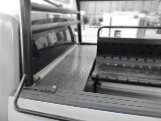 Instalada a lo ancho de la batea parte frontal, justo tras la cabina del vehículo de aproximadamente 40 cm de pisada antiderrapante con estructura de tubo de 1 ½” C-16., con sistema de rieles en acero inox para desmontarse.